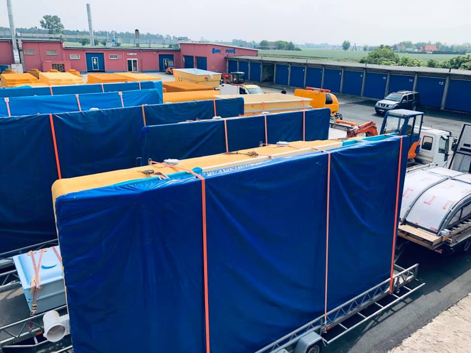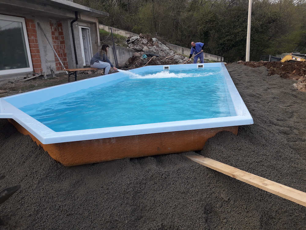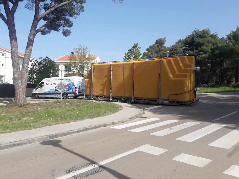Direktno dostavljamo nove proizvode na adresu kupaca diljem Europe. Izbjegavamo time dugo skladištenje i nepotrebne pretovare koji su potencijalni rizik za oštećenje proizvoda. Transport vršimo našim vozilima i prikolicama koji su raznih dimenzija. Trudimo se doći na svaku lokaciju, ukoliko radi gabarita nije moguć prolaz do vaše kuće može se raditi pretovar na neko drugo vozilo. Za spuštanje bazena u iskop potreban je kran.