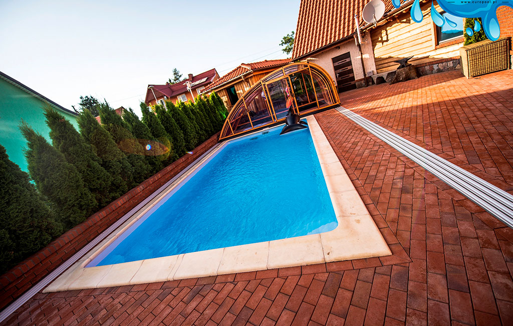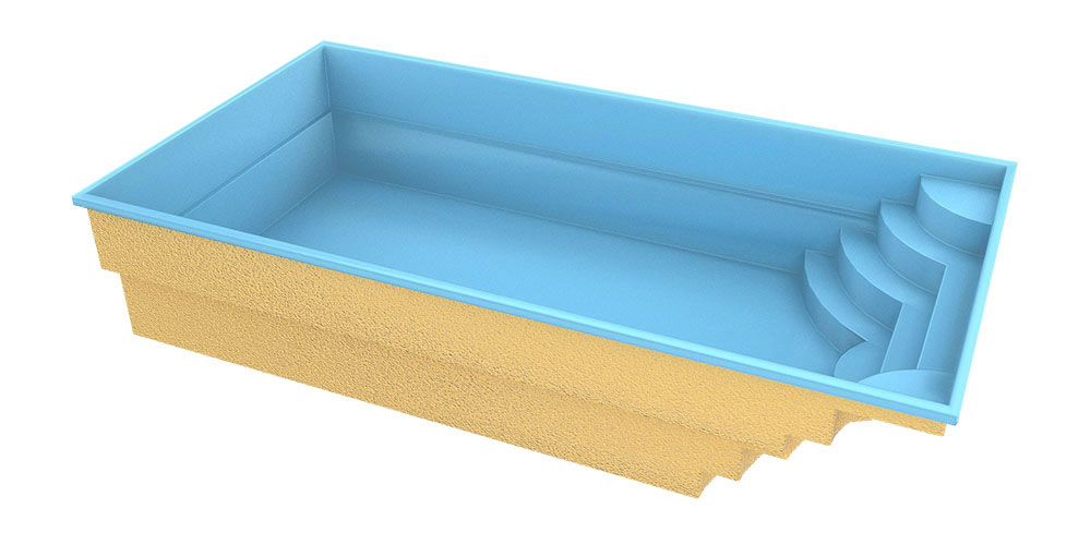 Pravokutni bazen sa velikim valovitim stepenicama.