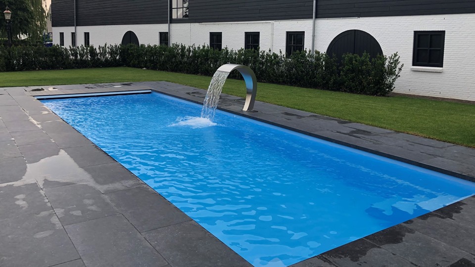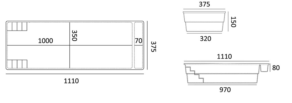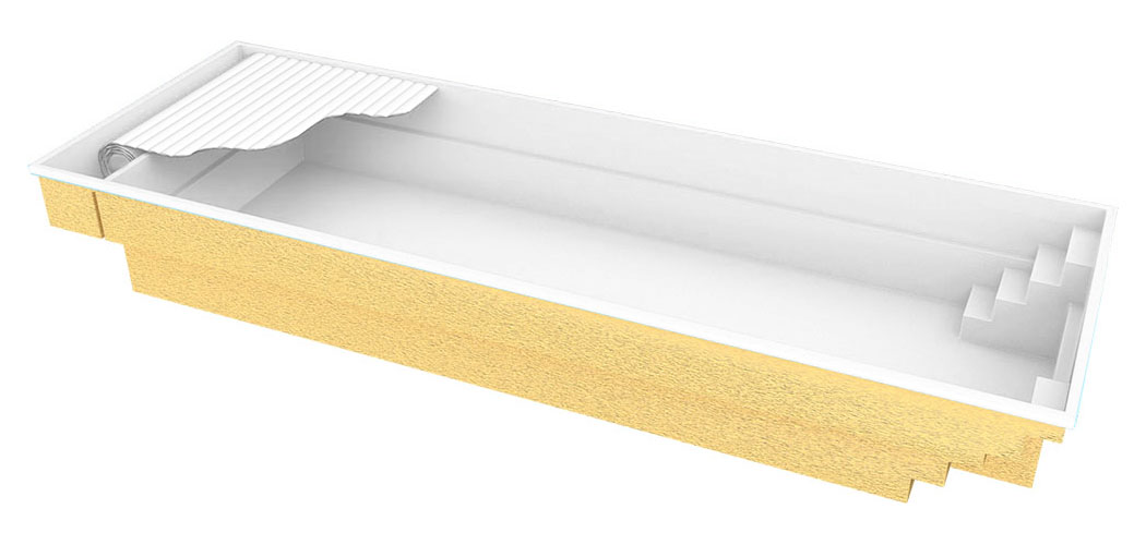 Veliki pravokutni bazen sa duplim manjim stepenicama,velikom površinom za plivanje i prostorom za ugradnju podvodne automatske rolete.